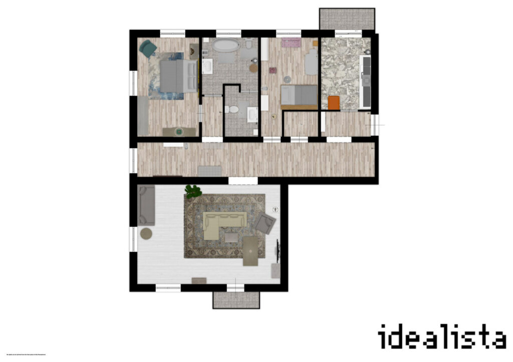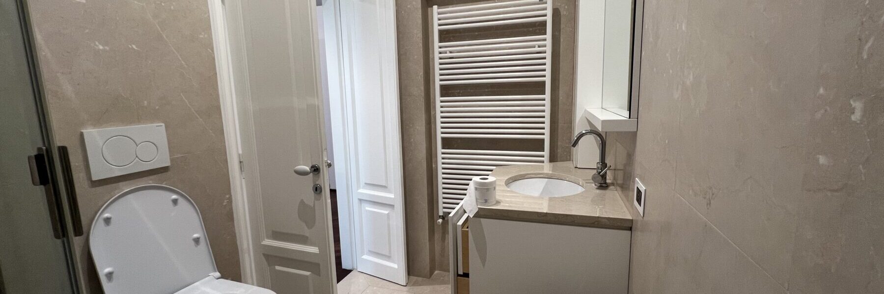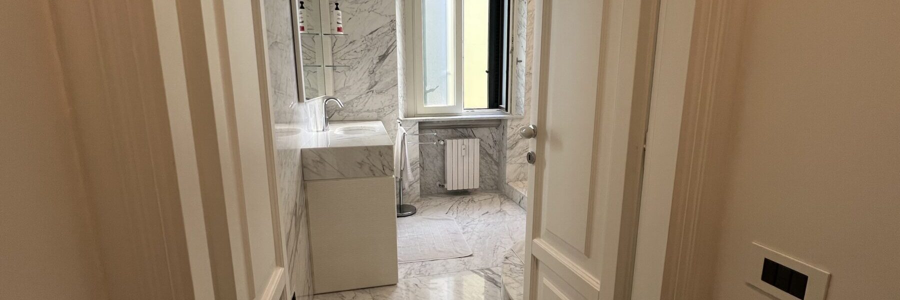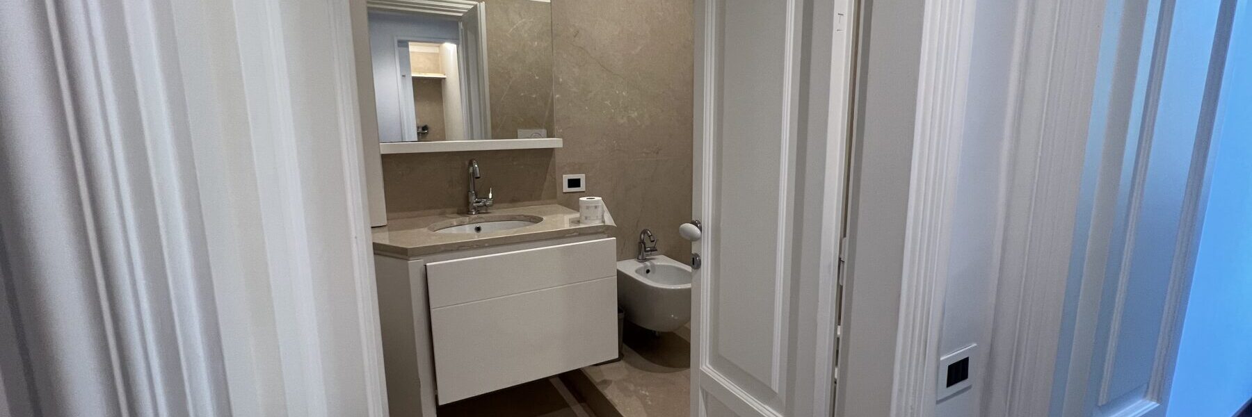 L’ampia zona living, caratterizzata da due finestre e un balcone, è arredata con gusto, comprendendo un comodo divano, una libreria e un tavolo. Le due camere da letto sono spaziose e dotate di armadi realizzati su misura, mentre i doppi servizi, rifiniti in marmo, offrono comfort e praticità. L’appartamento è stato recentemente ristrutturato con finiture di pregio e pavimenti in parquet, creando un ambiente elegante e accogliente.
