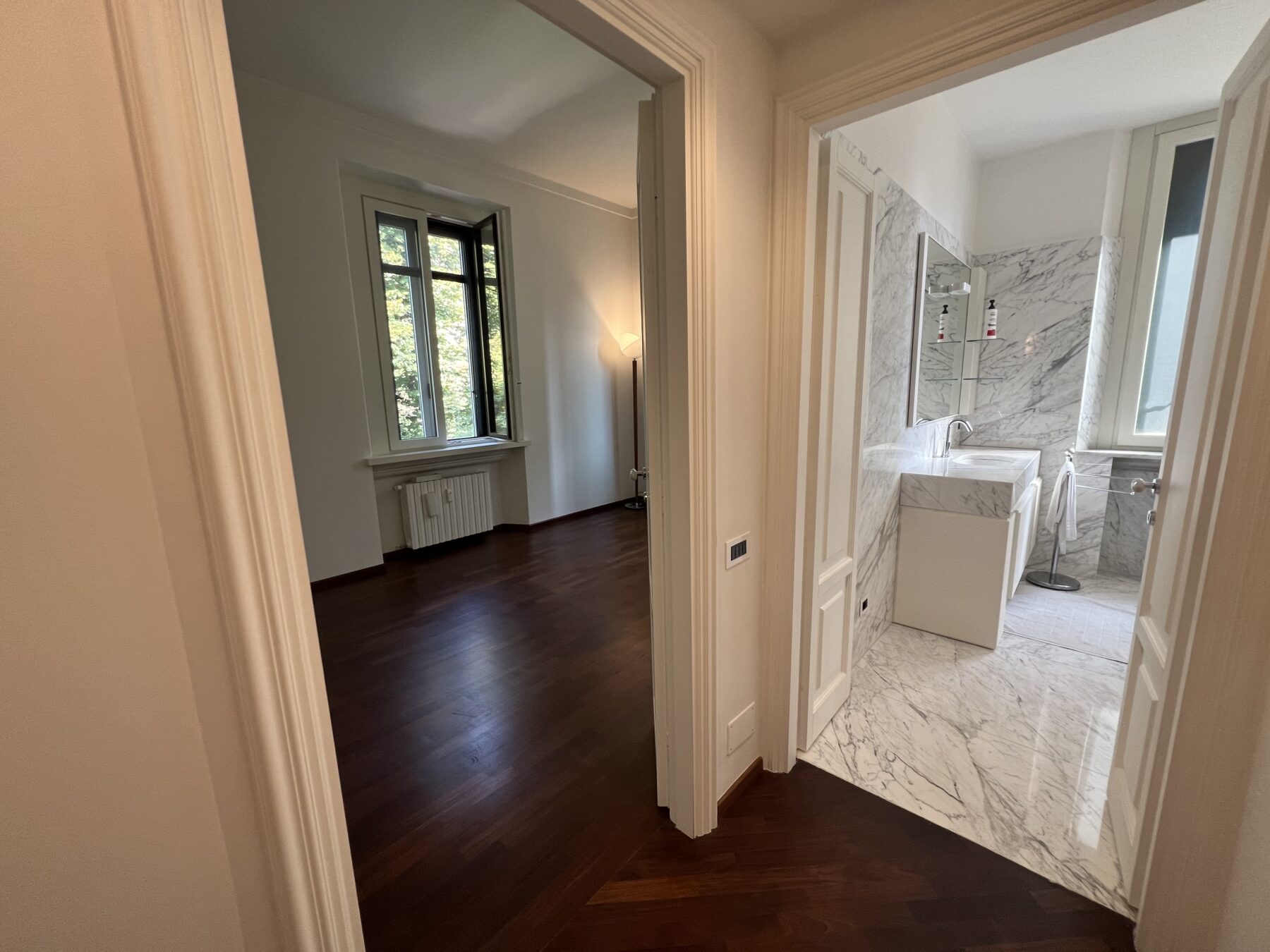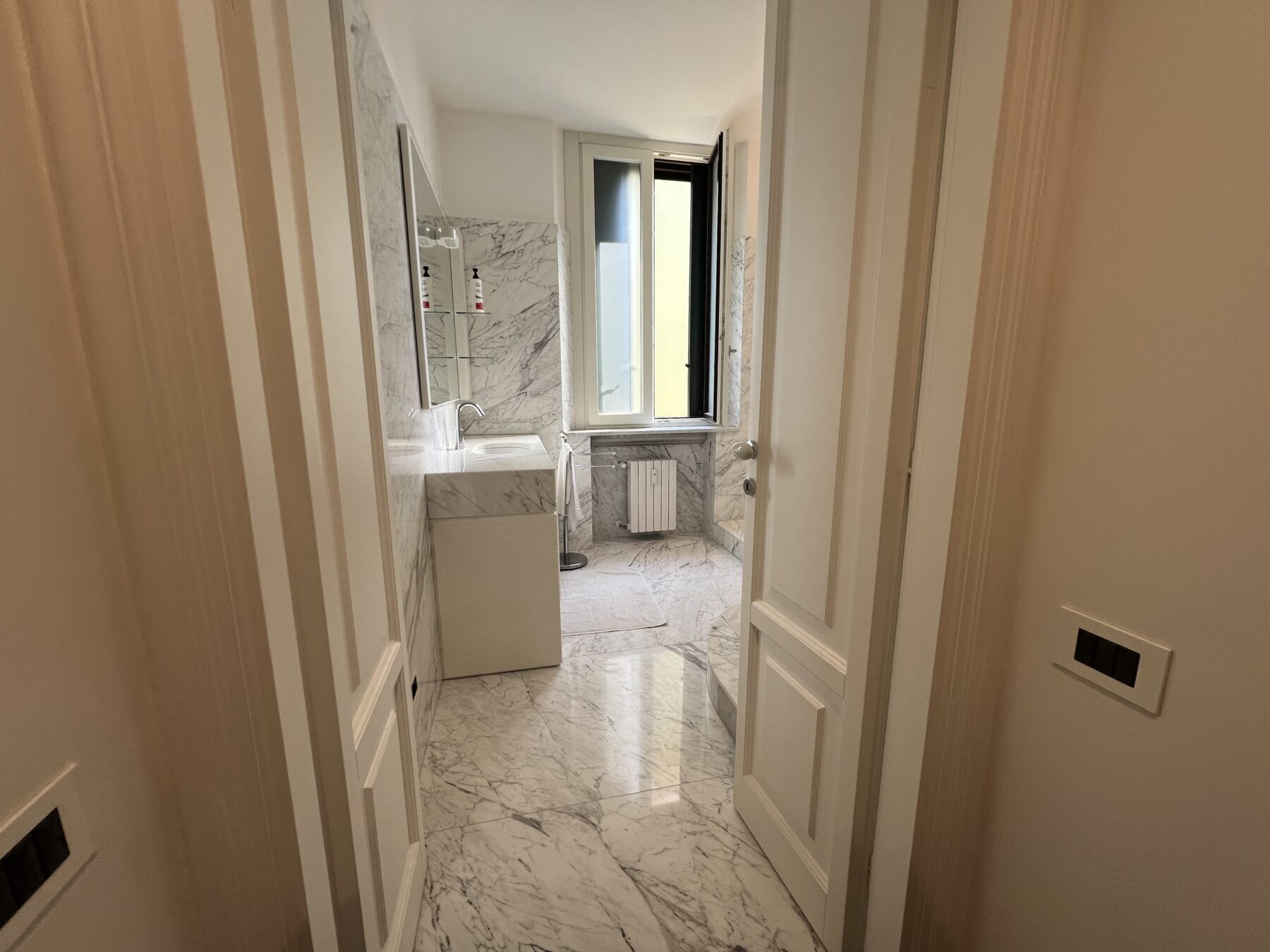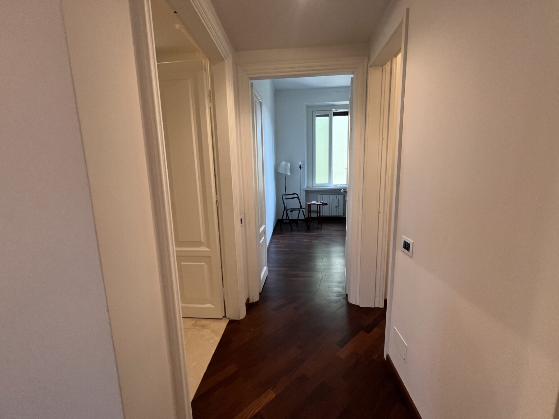 L’ampia zona living, caratterizzata da due finestre e un balcone, è arredata con gusto, comprendendo un comodo divano, una libreria e un tavolo. Le due camere da letto sono spaziose e dotate di armadi realizzati su misura, mentre i doppi servizi, rifiniti in marmo, offrono comfort e praticità. L’appartamento è stato recentemente ristrutturato con finiture di pregio e pavimenti in parquet, creando un ambiente elegante e accogliente.