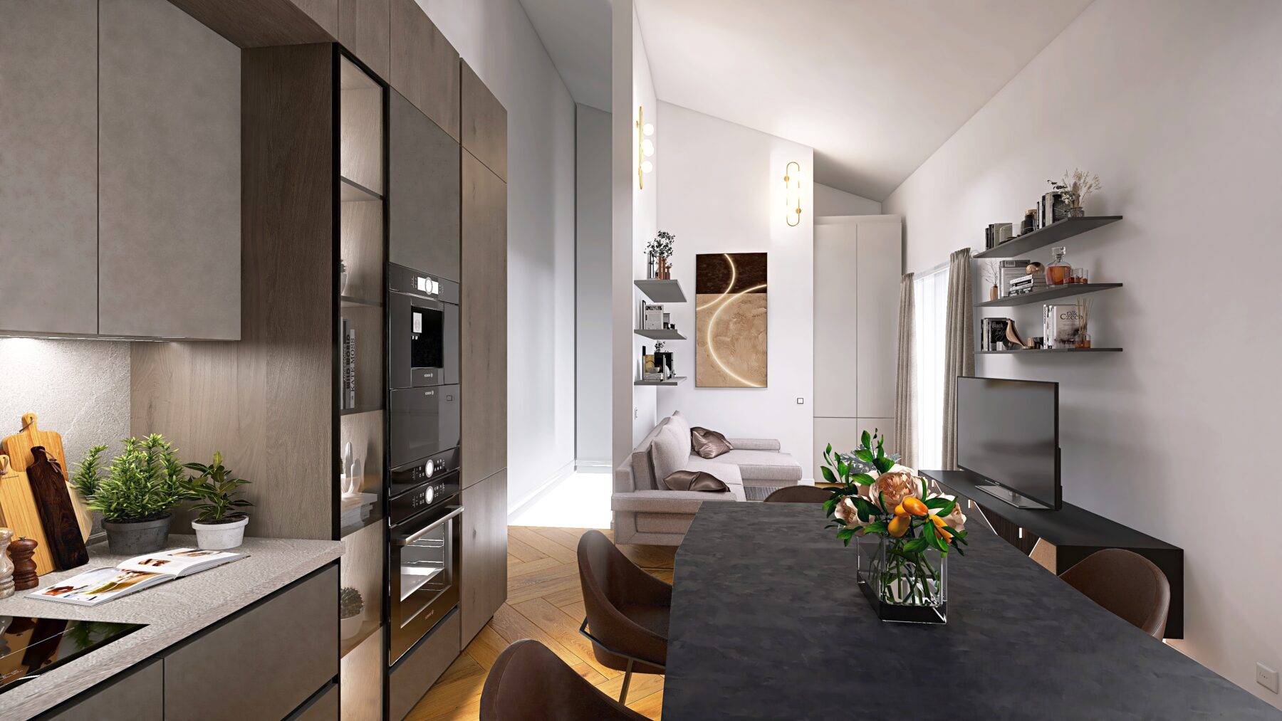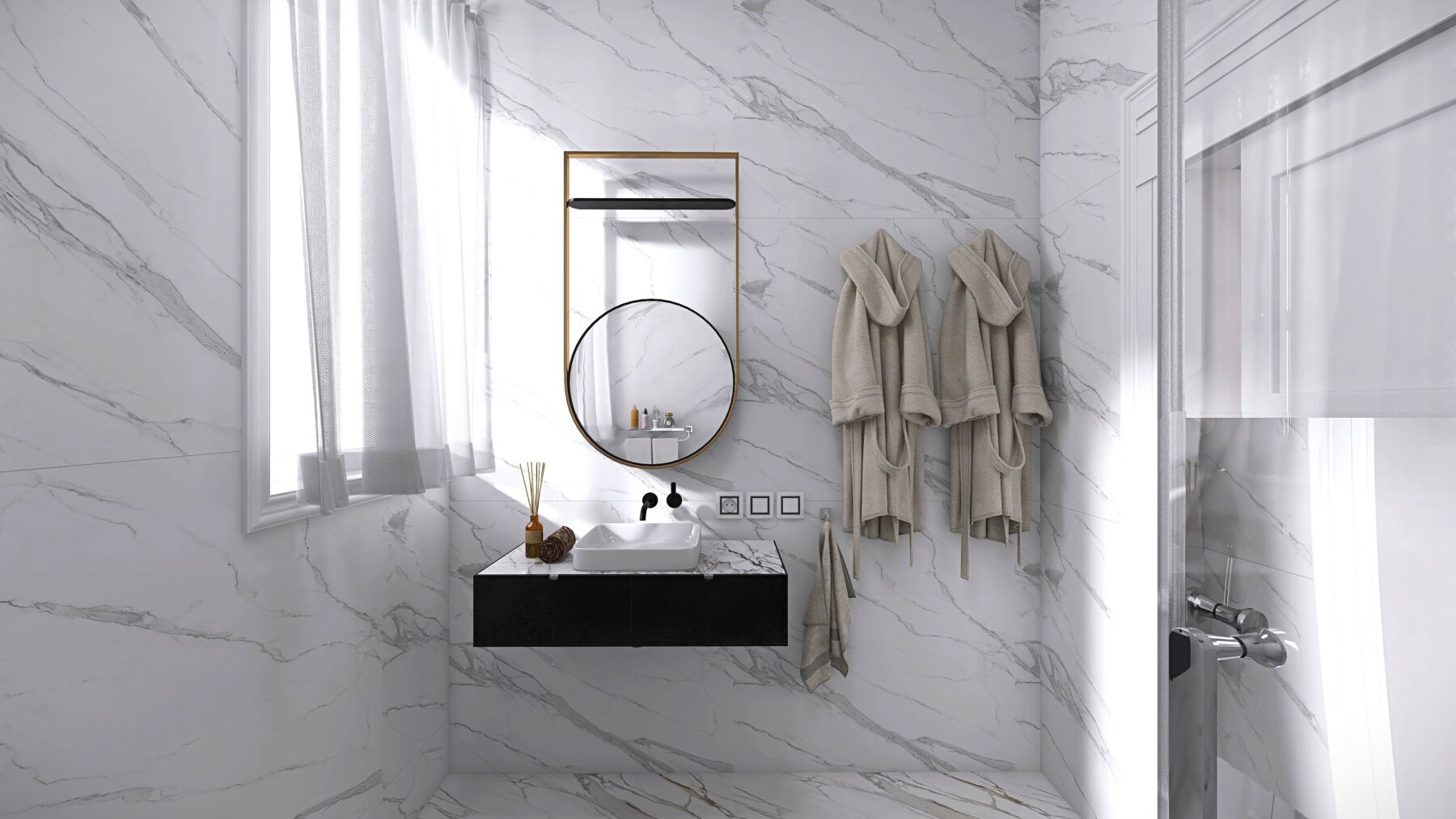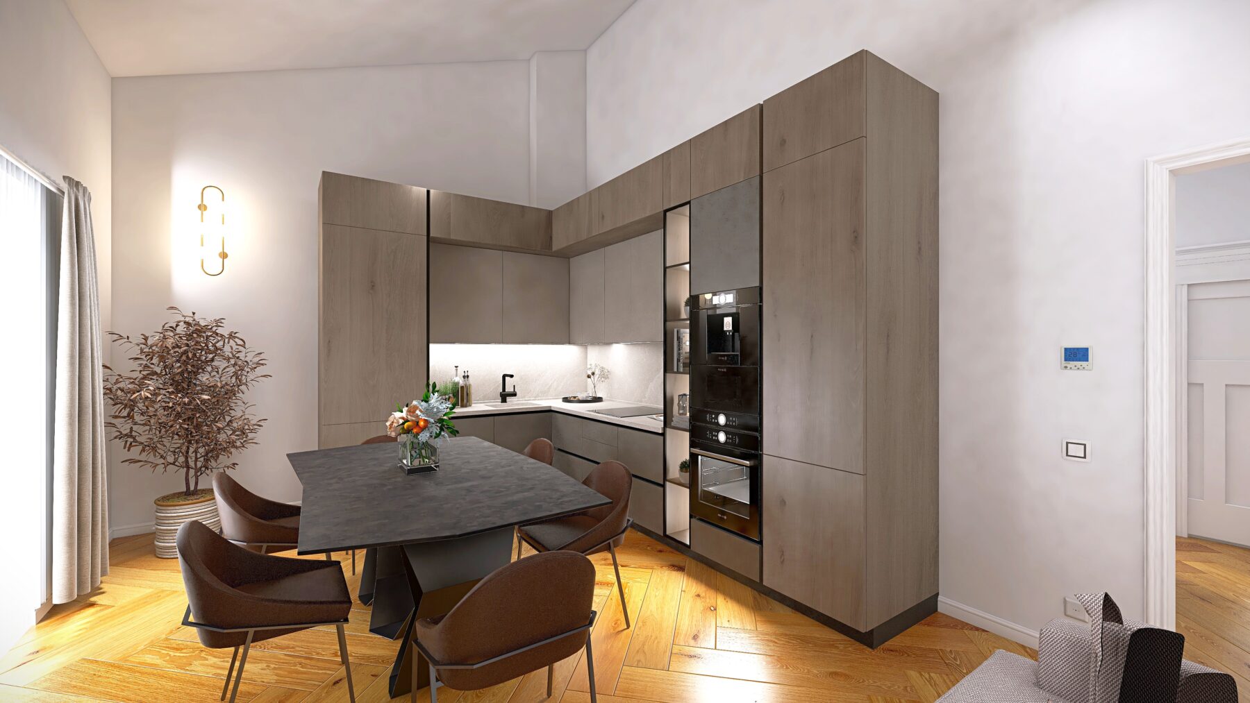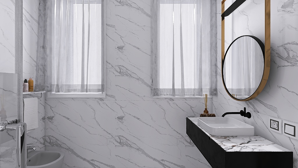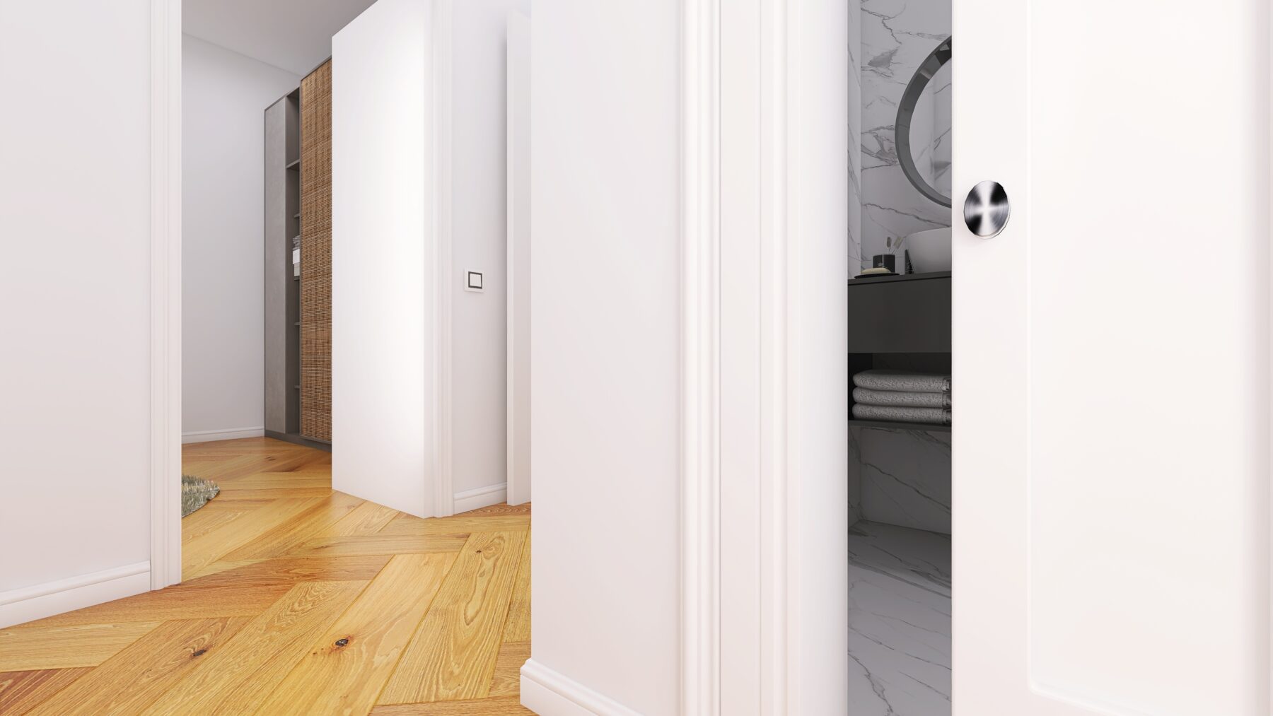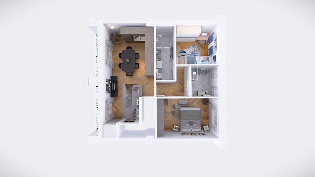 L’appartamento dispone di due camere da letto e due bagni rifiniti con eleganti rivestimenti in grès porcellanato effetto Calacatta e sanitari moderni sospesi, dotati di un ampia doccia, rubinetteria incassata con finitura cromo satinata, inoltre saranno realizzati degli abbassamenti a soffitto in cartongesso con led e gole luce nei bagni. Pavimenti in parquet di rovere posato a spina italiana e zoccolino alla francese da 10 cm. La climatizzazione è garantita da un sistema Daikin, mentre il riscaldamento a pavimento autonomo assicura un comfort ottimale in ogni stagione, impianto elettrico in semi domotica “Living Now”. I serramenti in PVC con triplo vetro e cerniere a scomparsa garantiscono un’ottima efficienza energetica, persiane in alluminio, rendendo questo appartamento non solo bello ma anche sostenibile.
