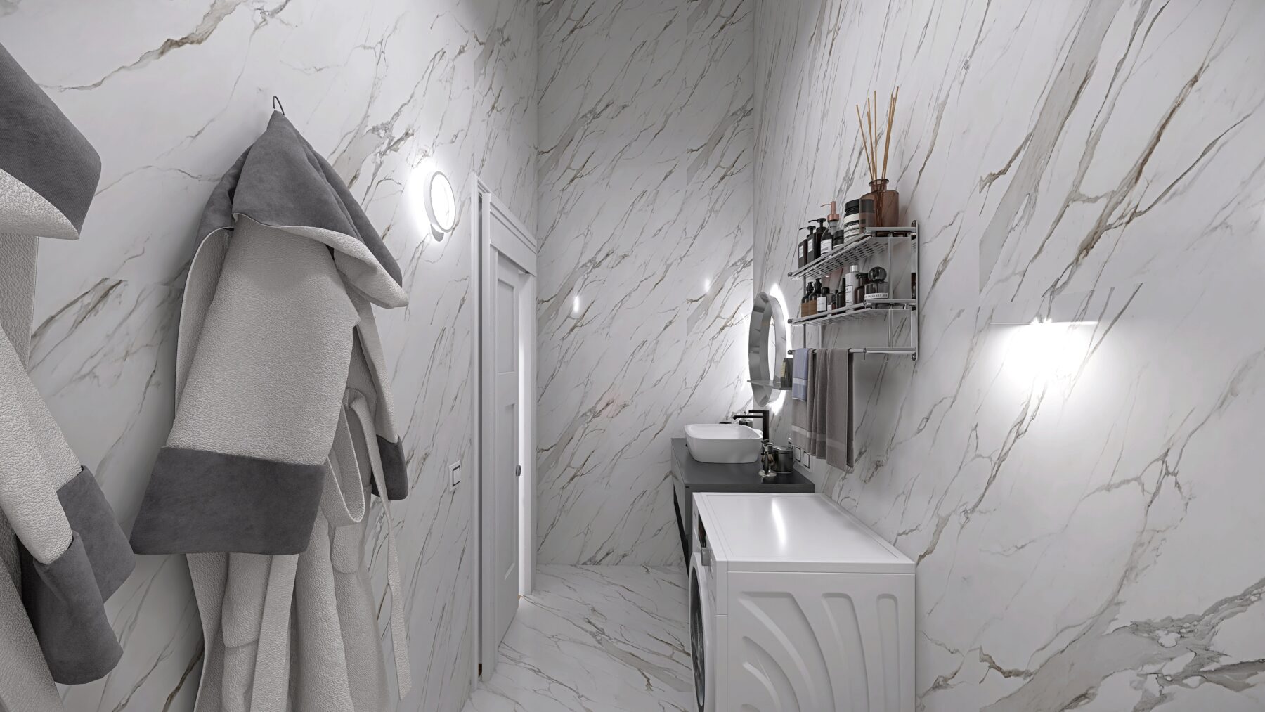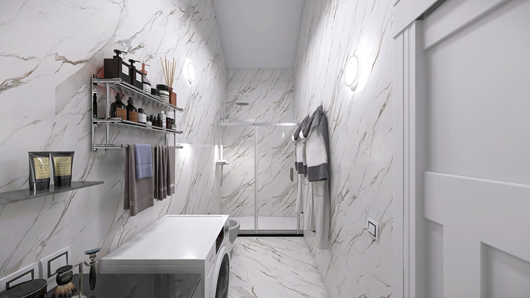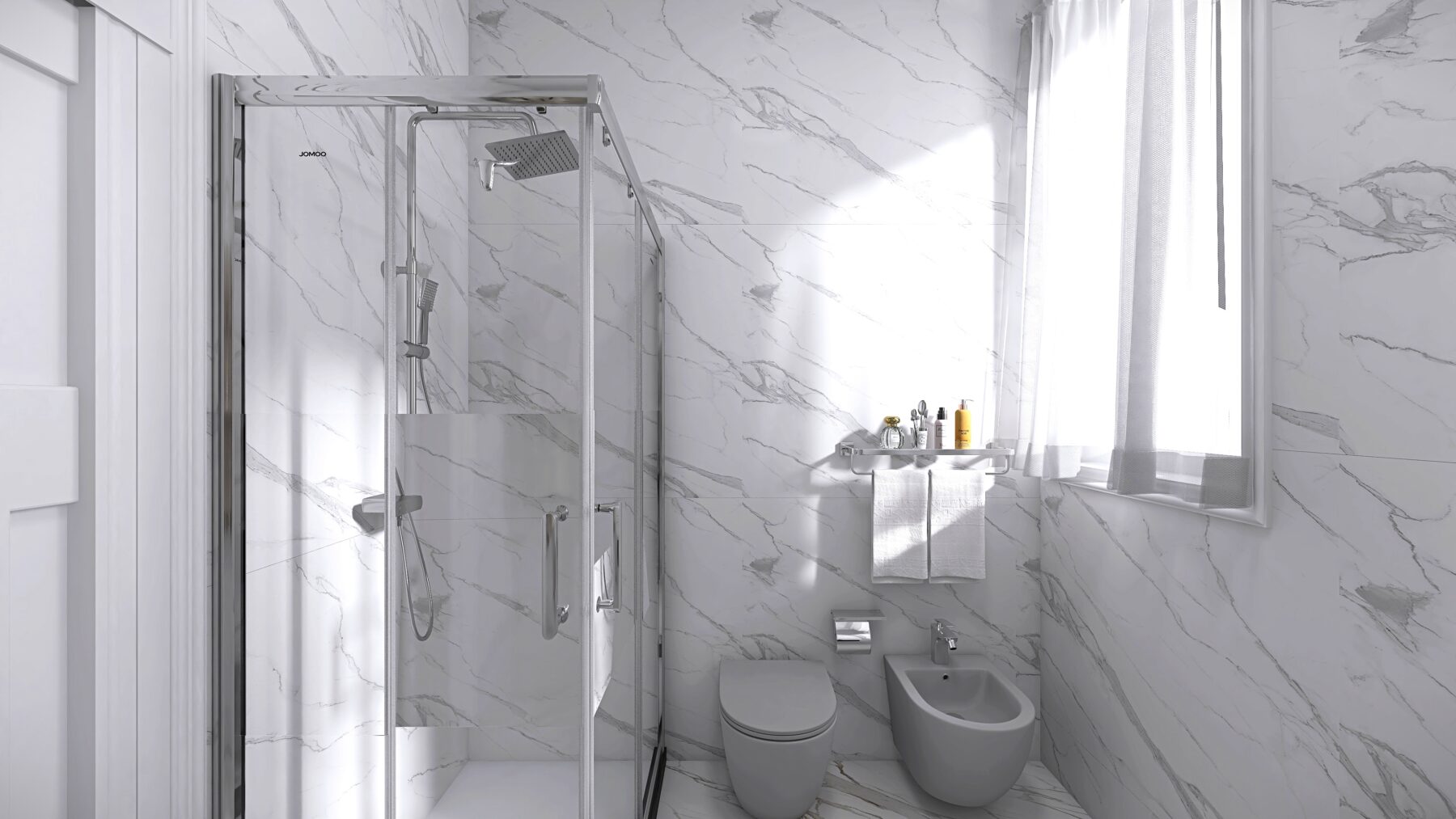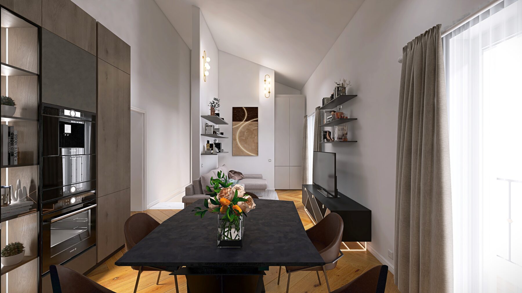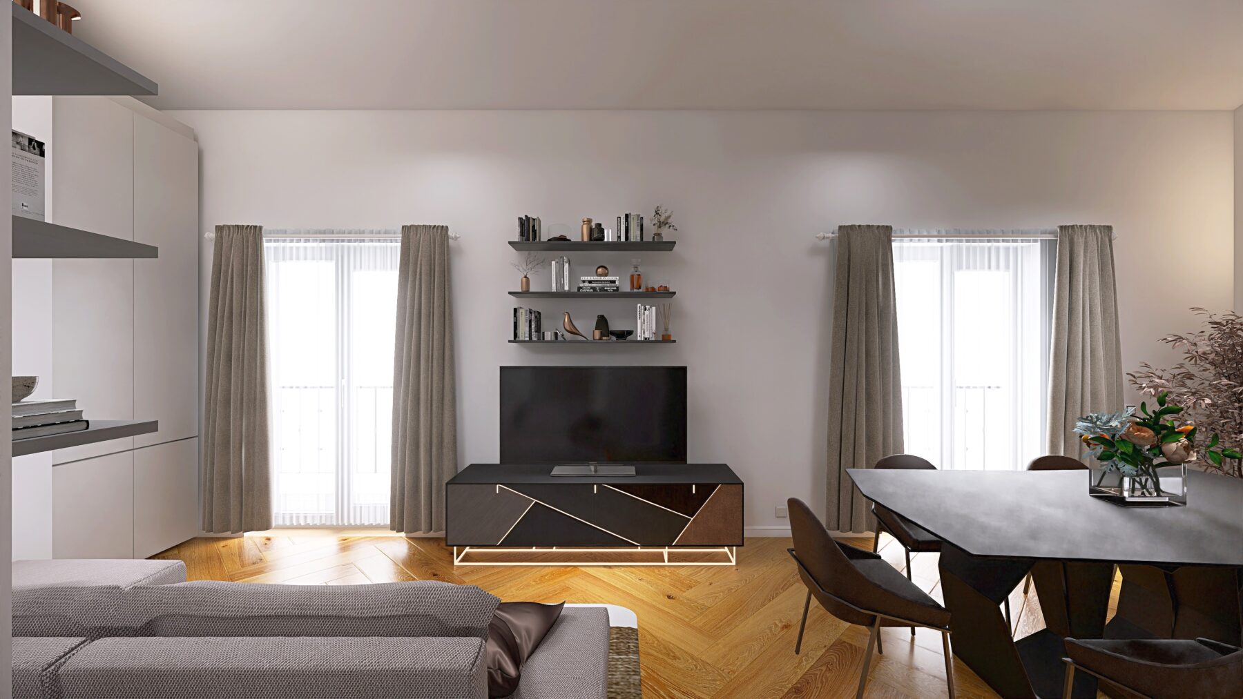 L’appartamento dispone di due camere da letto e due bagni rifiniti con eleganti rivestimenti in grès porcellanato effetto Calacatta e sanitari moderni sospesi, dotati di un ampia doccia, rubinetteria incassata con finitura cromo satinata, inoltre saranno realizzati degli abbassamenti a soffitto in cartongesso con led e gole luce nei bagni. Pavimenti in parquet di rovere posato a spina italiana e zoccolino alla francese da 10 cm. La climatizzazione è garantita da un sistema Daikin, mentre il riscaldamento a pavimento autonomo assicura un comfort ottimale in ogni stagione, impianto elettrico in semi domotica “Living Now”. I serramenti in PVC con triplo vetro e cerniere a scomparsa garantiscono un’ottima efficienza energetica, persiane in alluminio, rendendo questo appartamento non solo bello ma anche sostenibile.