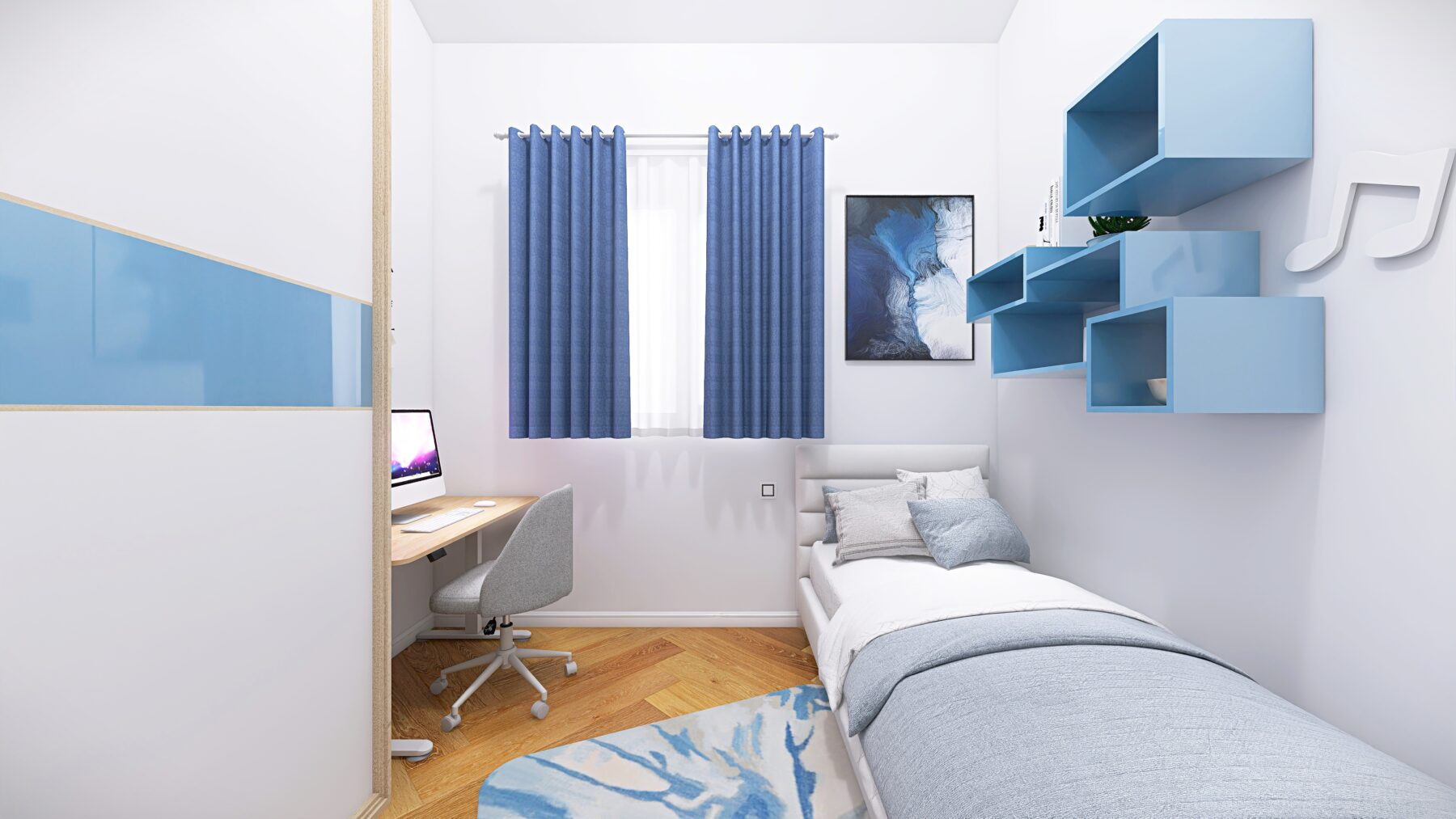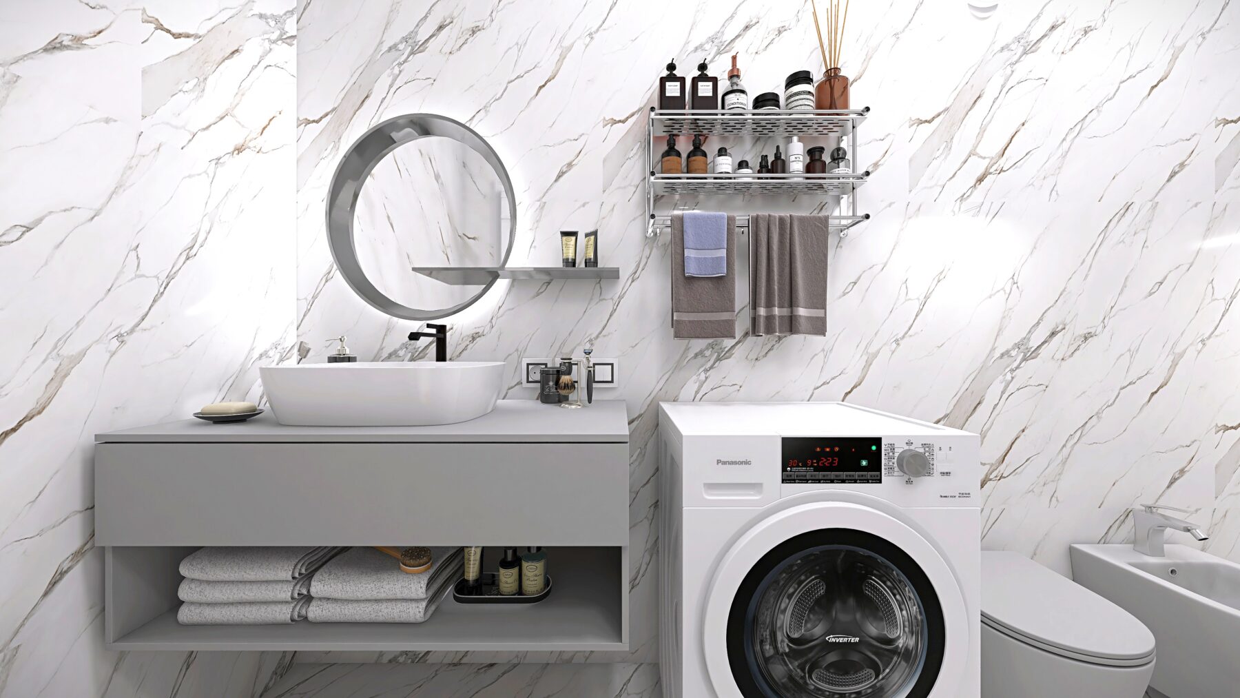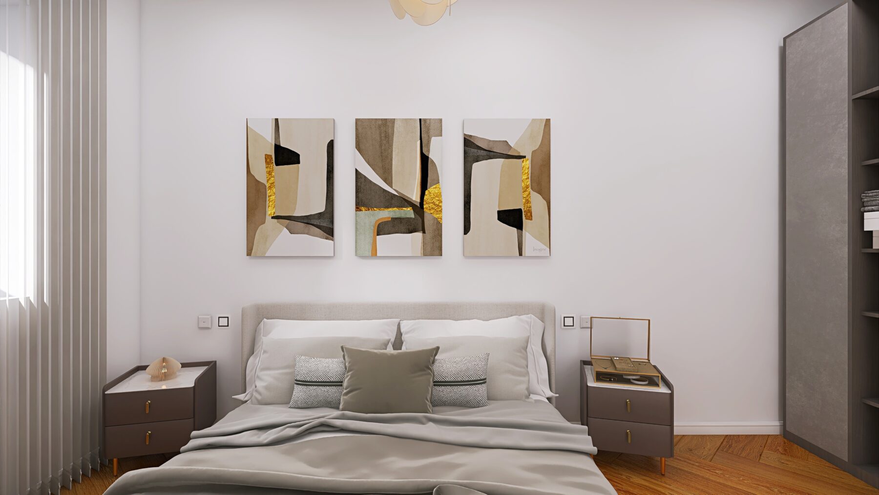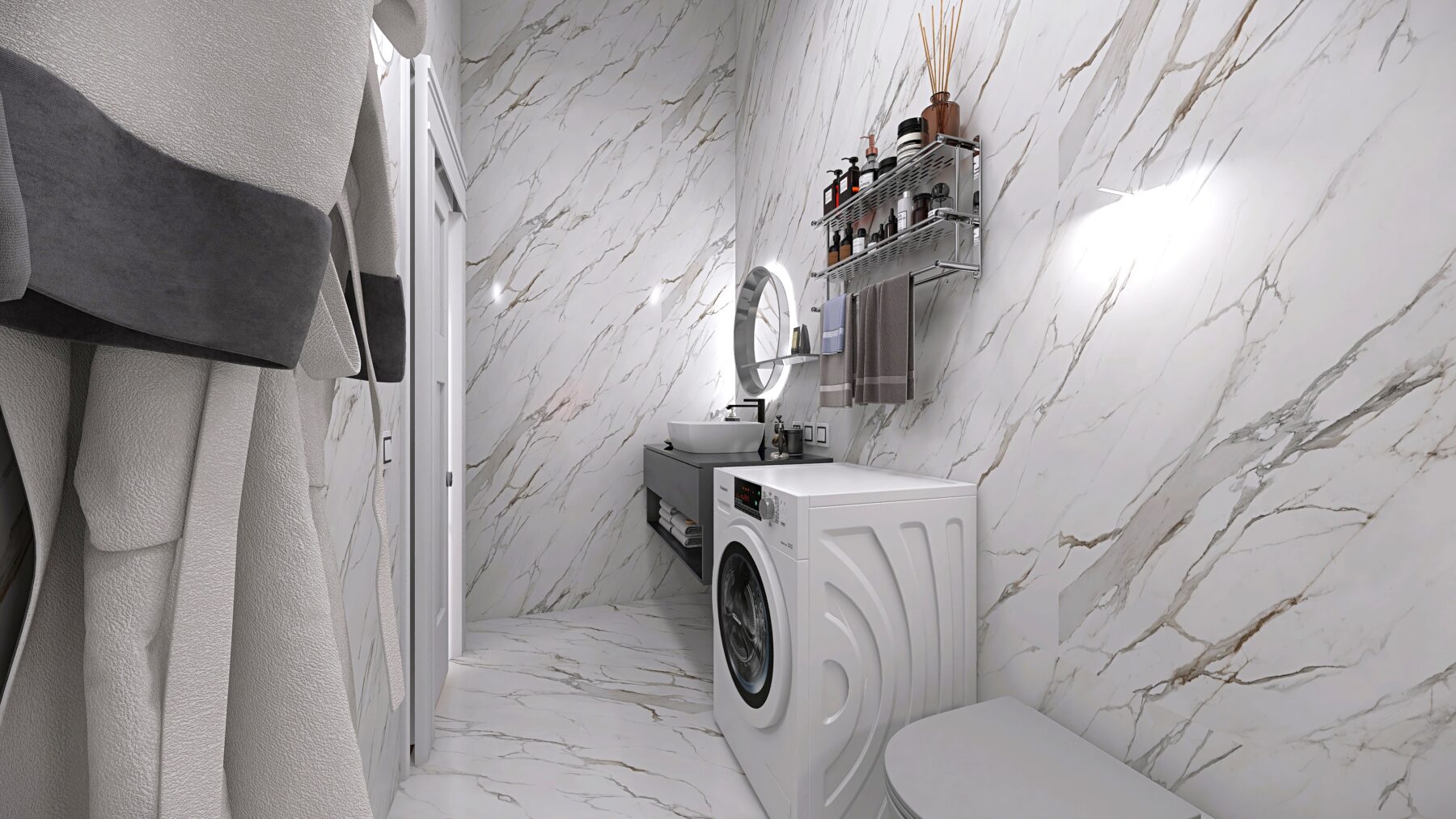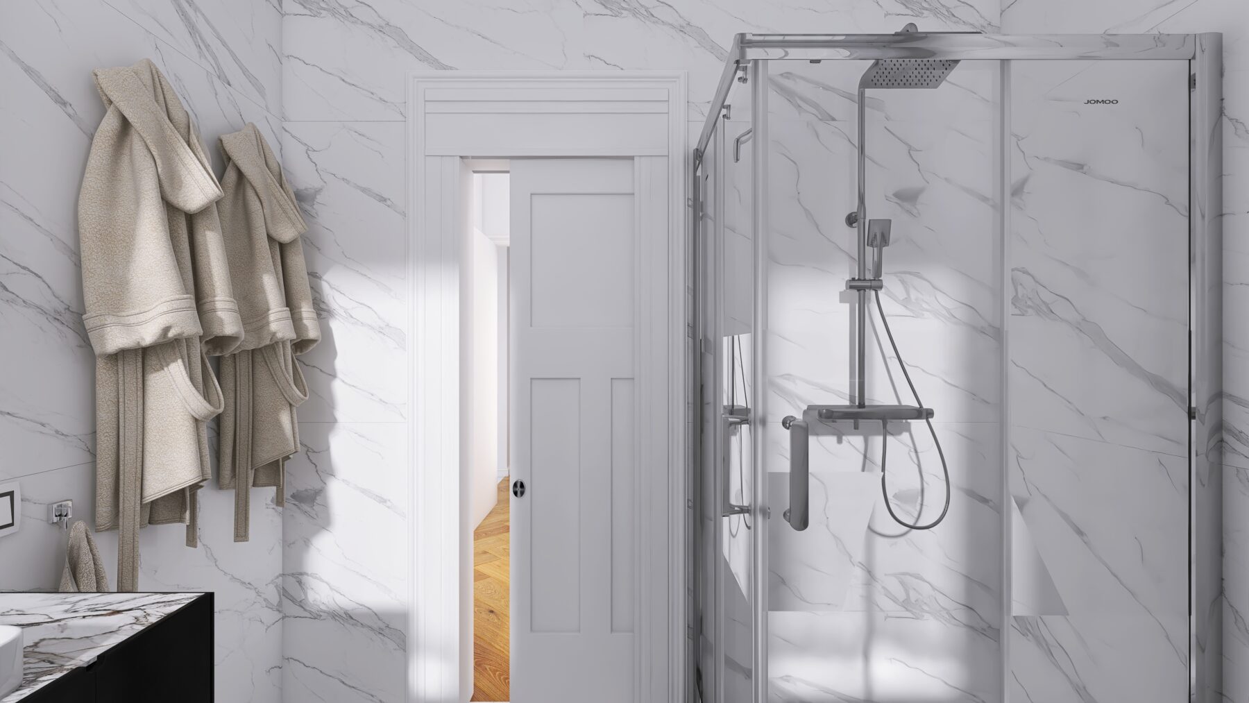 L’appartamento dispone di due camere da letto e due bagni rifiniti con eleganti rivestimenti in grès porcellanato effetto Calacatta e sanitari moderni sospesi, dotati di un ampia doccia, rubinetteria incassata con finitura cromo satinata, inoltre saranno realizzati degli abbassamenti a soffitto in cartongesso con led e gole luce nei bagni. Pavimenti in parquet di rovere posato a spina italiana e zoccolino alla francese da 10 cm. La climatizzazione è garantita da un sistema Daikin, mentre il riscaldamento a pavimento autonomo assicura un comfort ottimale in ogni stagione, impianto elettrico in semi domotica “Living Now”. I serramenti in PVC con triplo vetro e cerniere a scomparsa garantiscono un’ottima efficienza energetica, persiane in alluminio, rendendo questo appartamento non solo bello ma anche sostenibile.